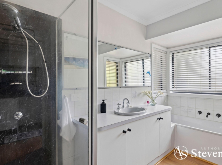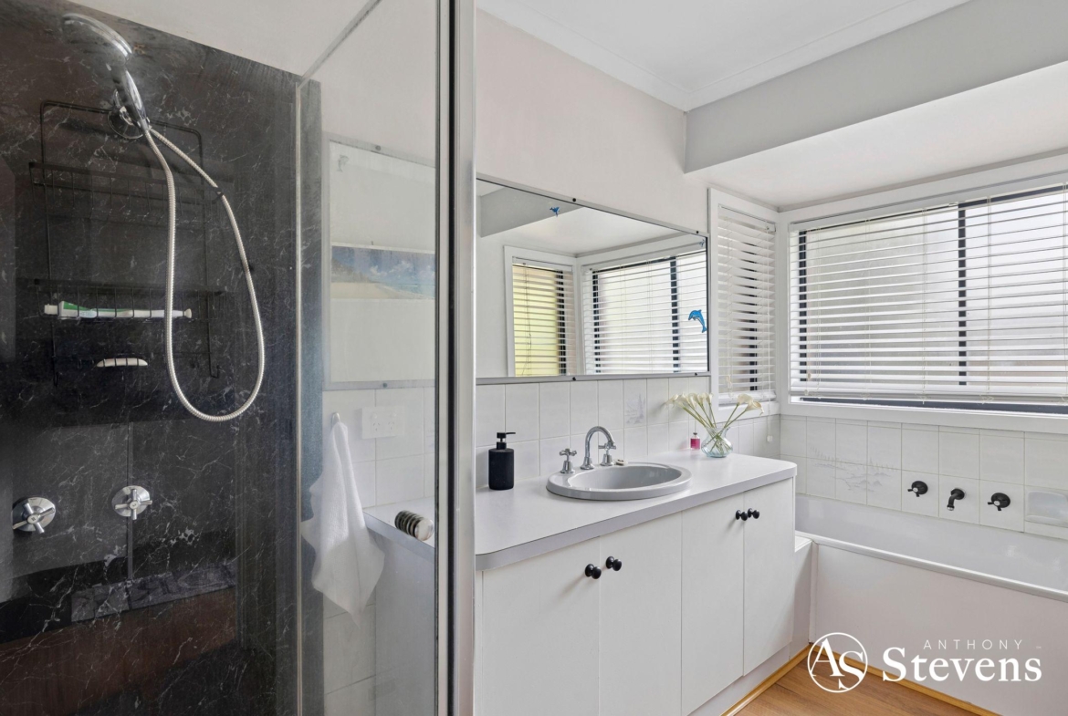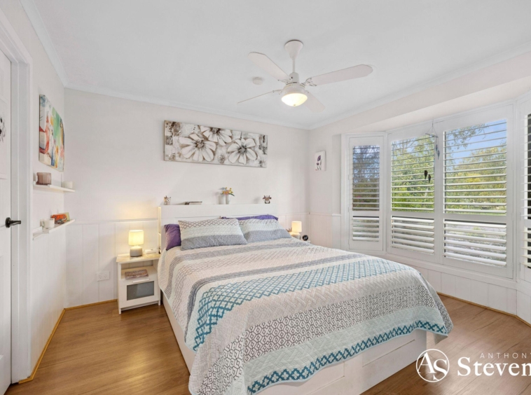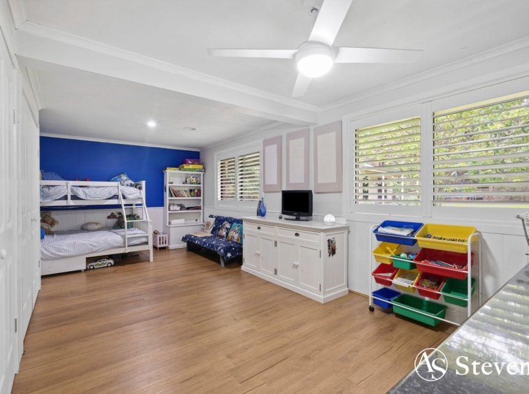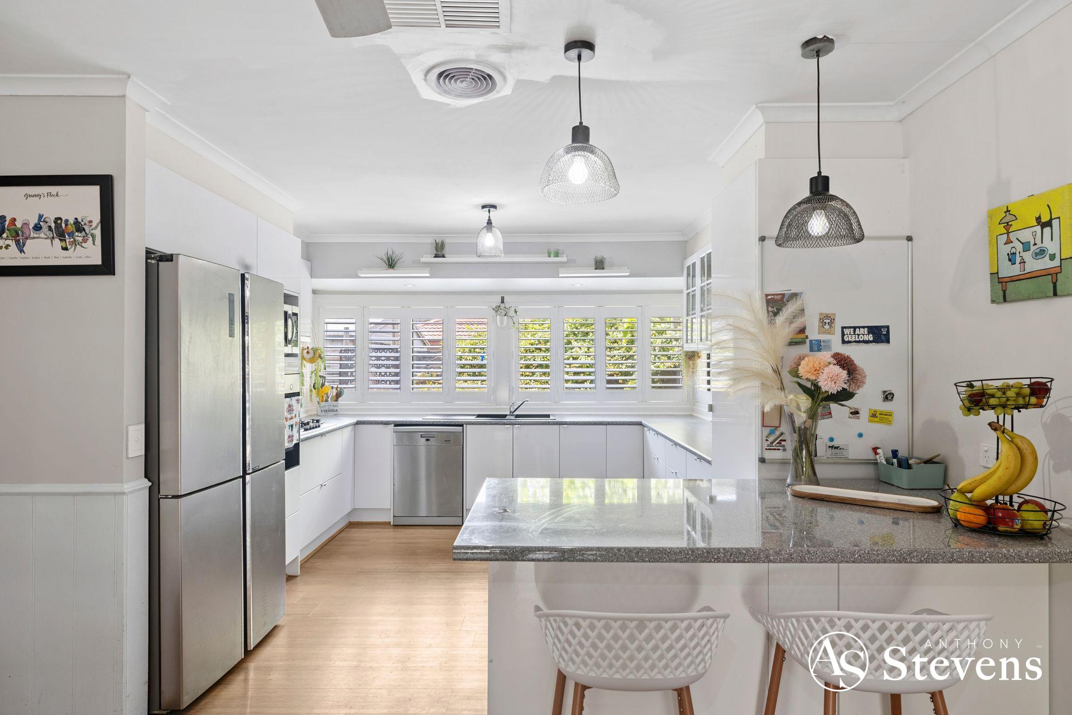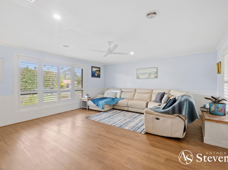 Inside, you’ll find four bedrooms, including a master suite with walk-in robe and ensuite. The remaining bedrooms feature built-in robes, with the fourth large enough to double as a second living area. Plantation shutters throughout add a stylish touch, while the kitchen is equipped with quality appliances including a Miele dishwasher and Bosch oven and cooktop. Ducted heating and evaporative cooling ensure year-round comfort with solar panels for energy efficiency.