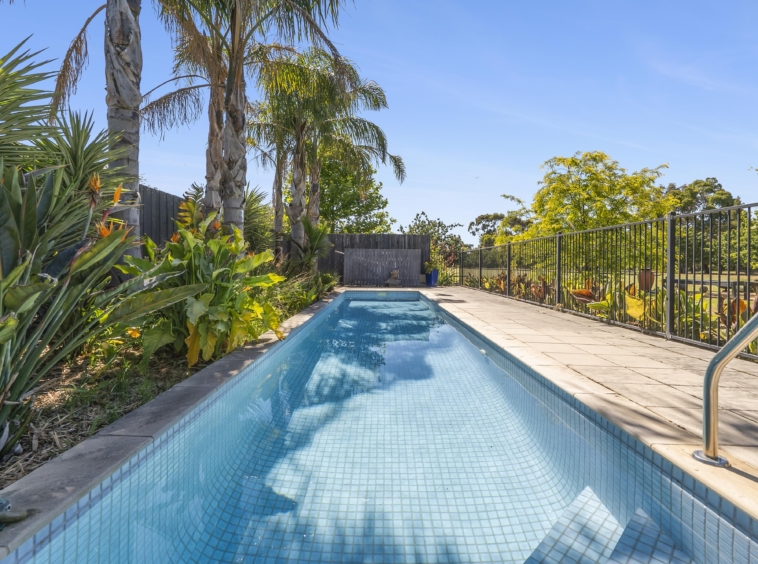 Glass bifold doors open seamlessly from the family room to a timber-decked verandah, stepping down to an inviting pergola draped in lush greenery – the perfect summer entertaining zone overlooking the solar-heated pool. A tranquil space to host friends, enjoy long lunches or simply unwind.