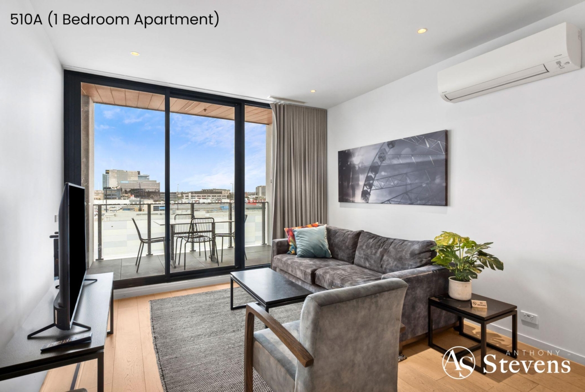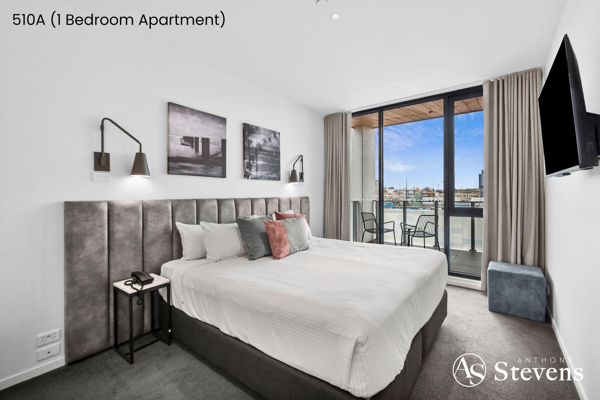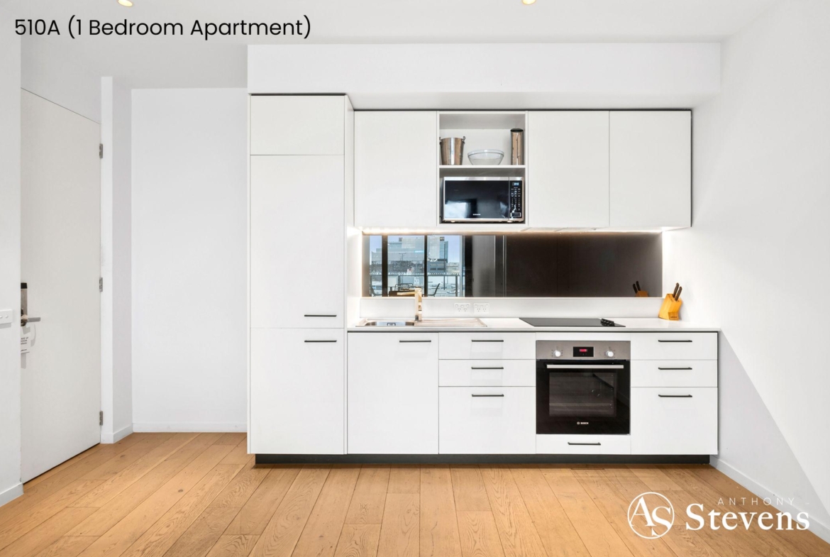 • 510A – One-Bedroom Apartment: Features an open-plan kitchen, meals and living area opening to a balcony with glimpses of the bay, plus a separate bedroom and bathroom.
