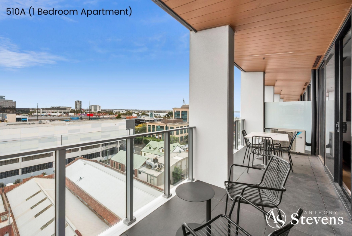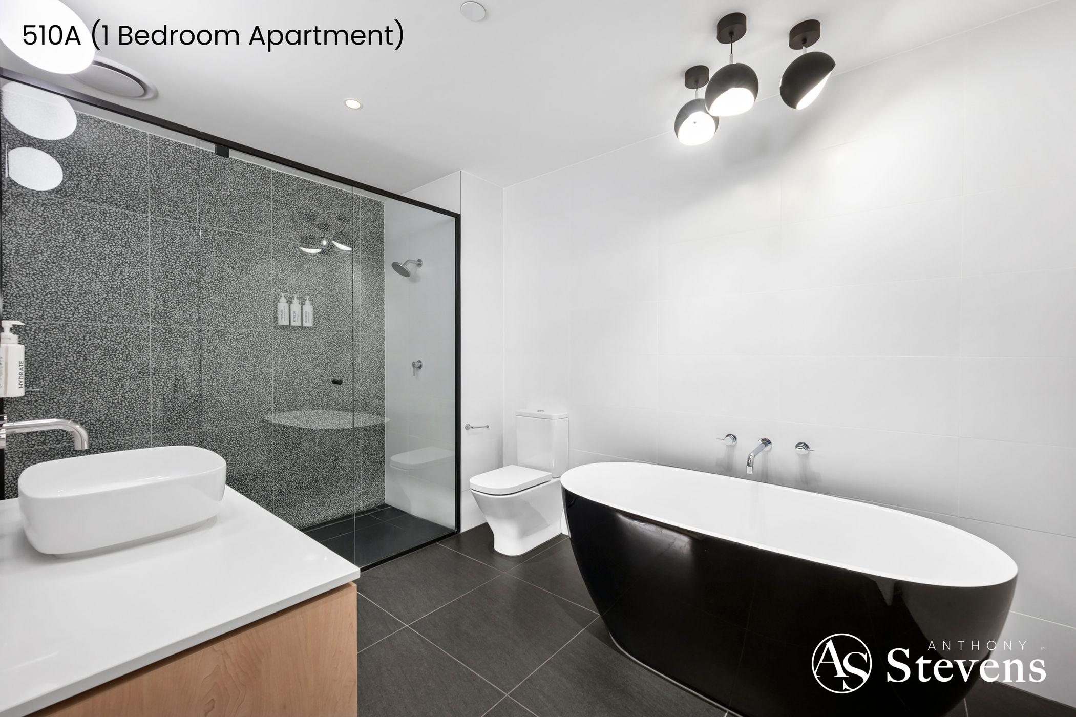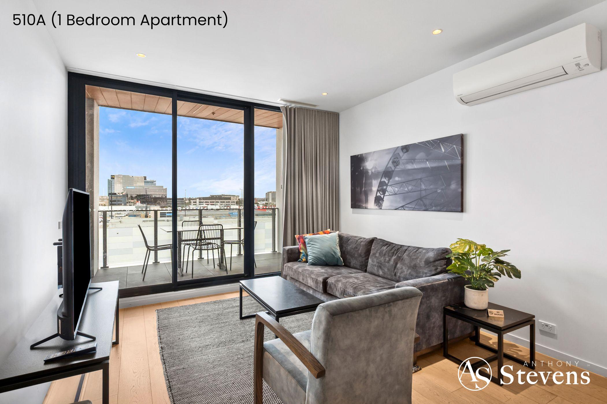 • 510A – One-Bedroom Apartment: Features an open-plan kitchen, meals and living area opening to a balcony with glimpses of the bay, plus a separate bedroom and bathroom.