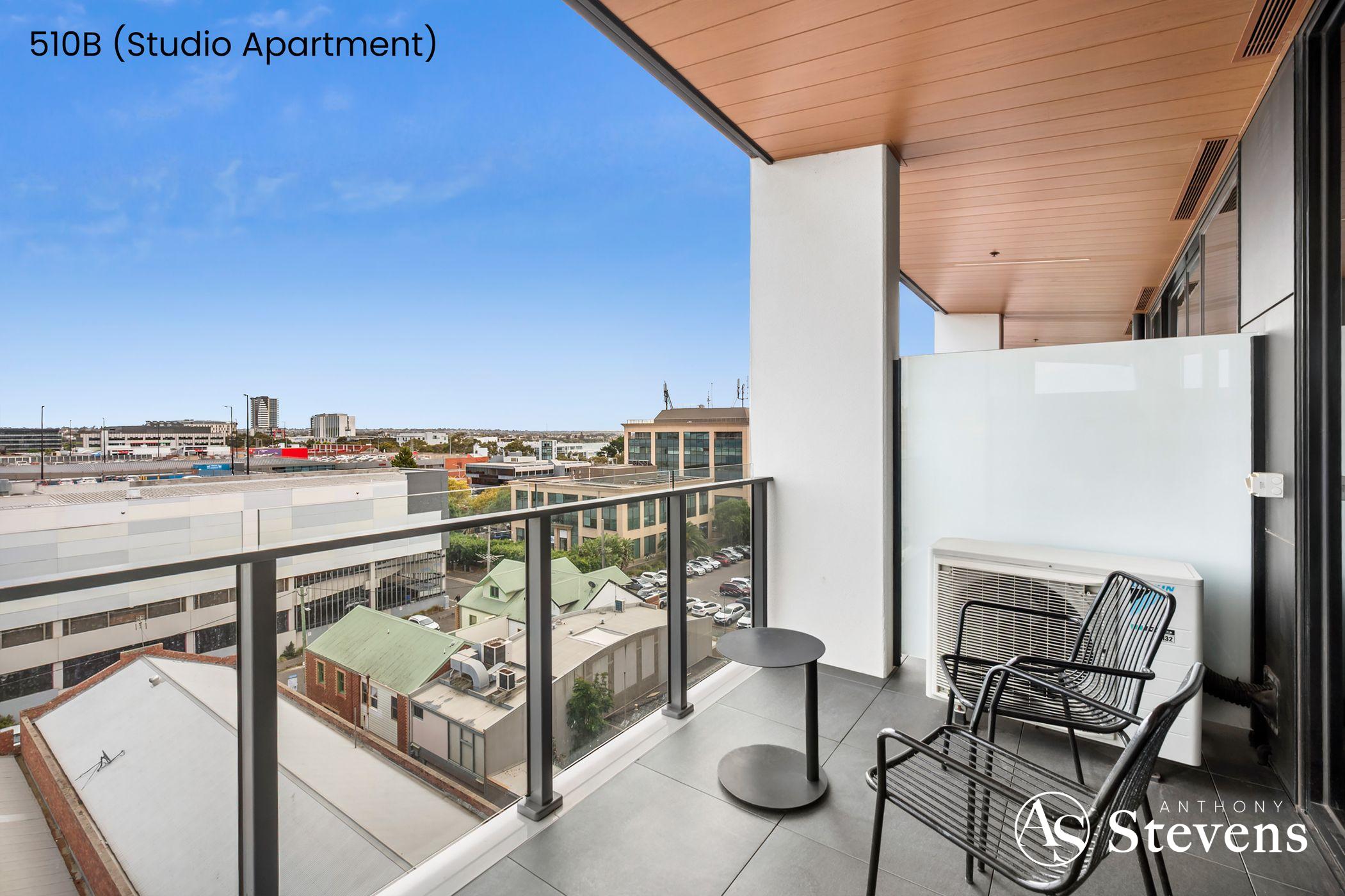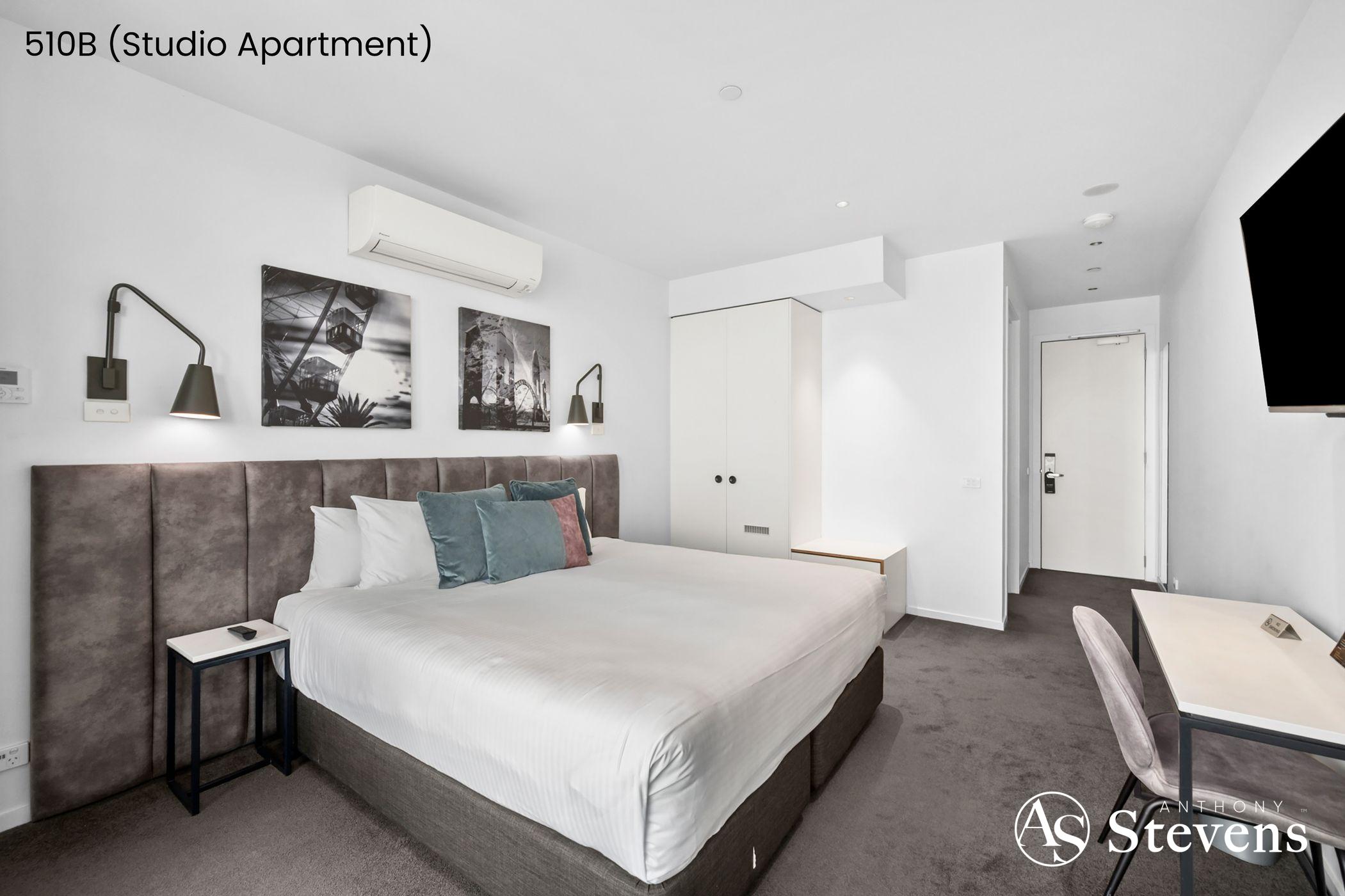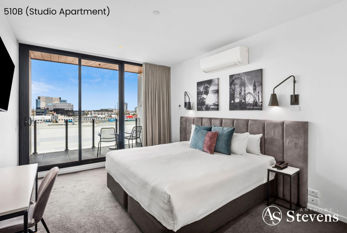• 510B – Studio Apartment: A motel-style suite with open-plan bedroom/living, separate bathroom, bar fridge/tea/coffee facilities, and its own smaller balcony with similar outlooks.