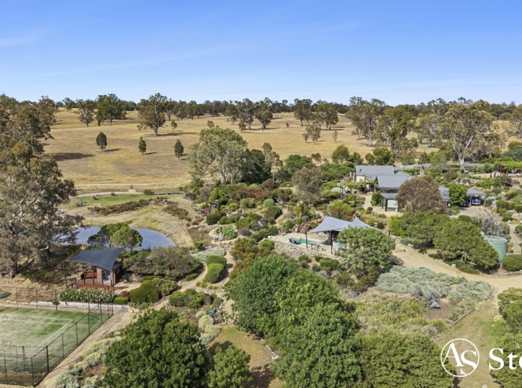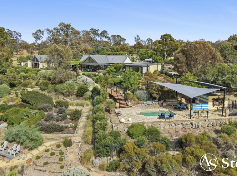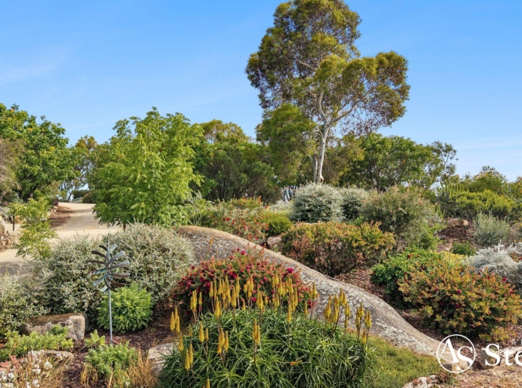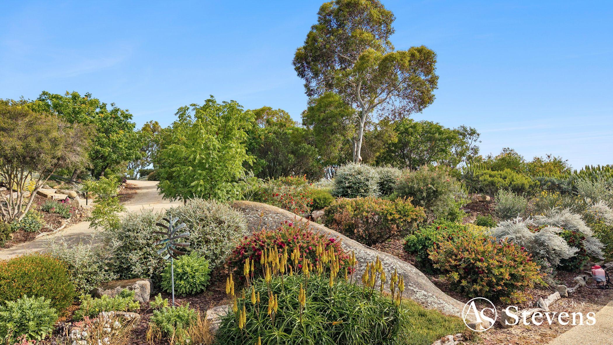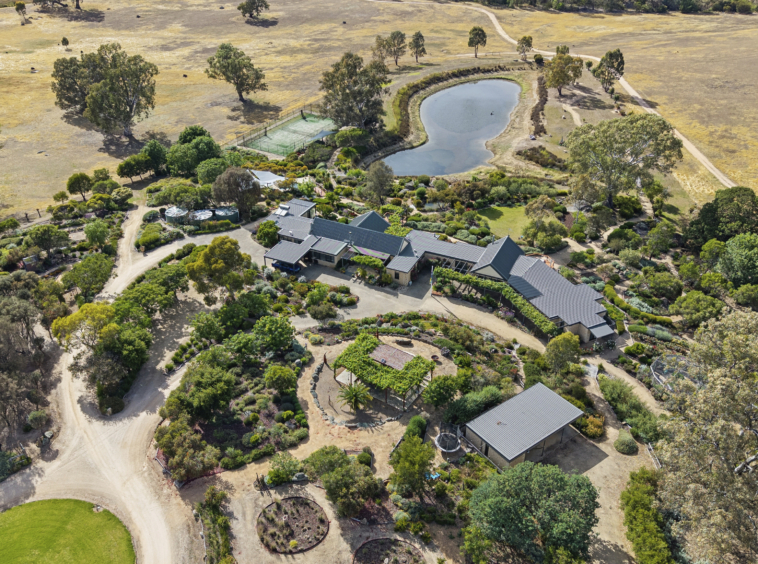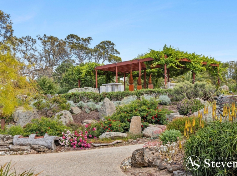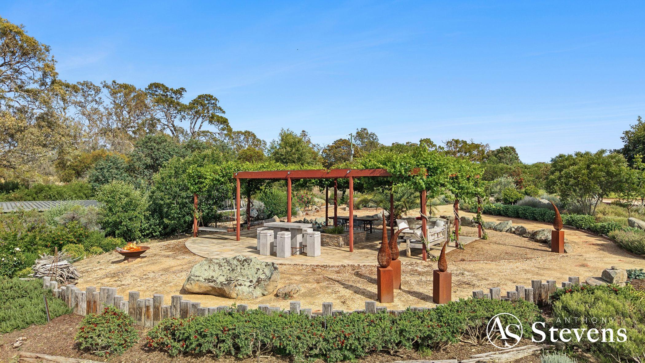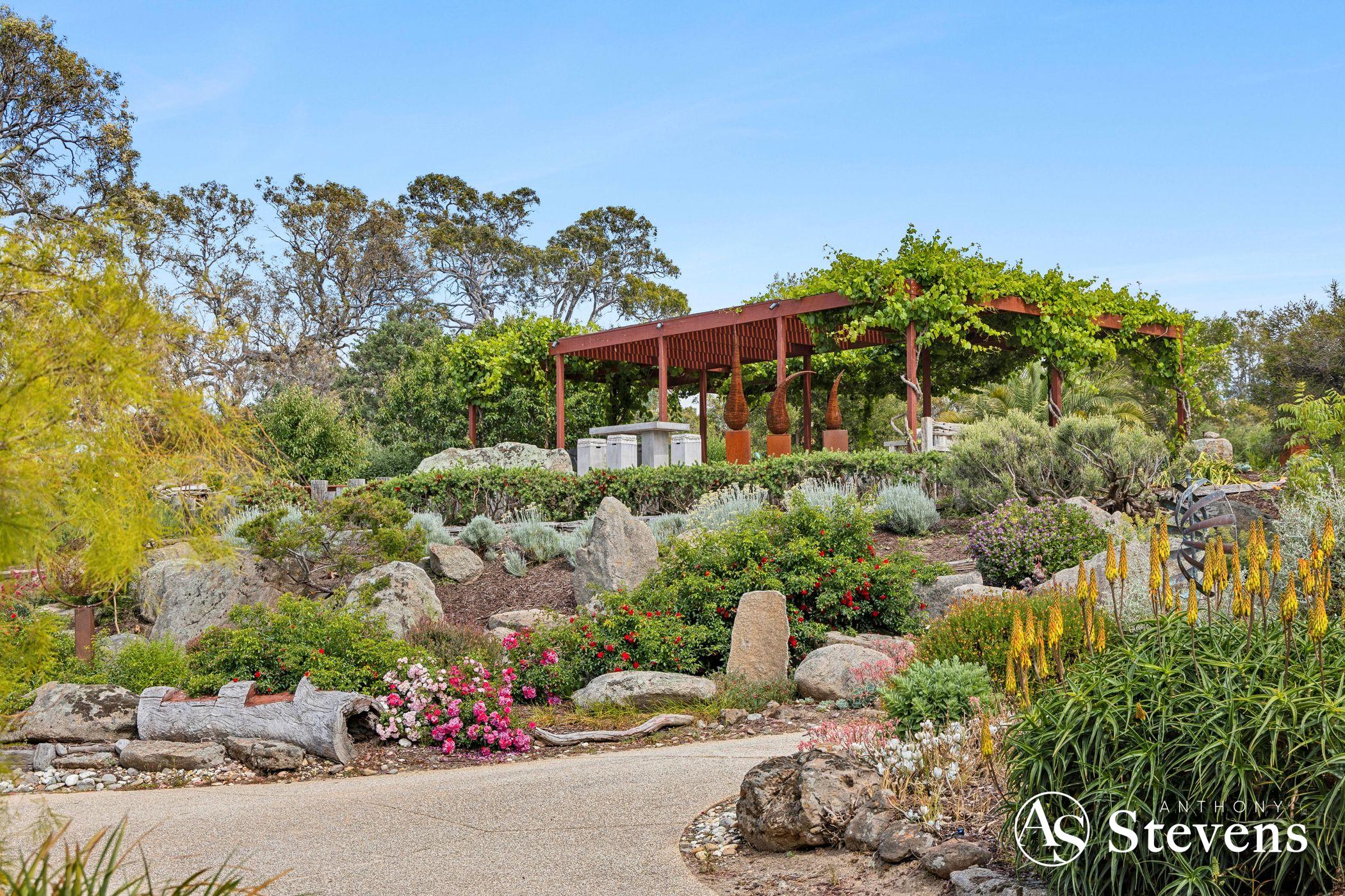 At the heart of the estate lies a five-acre landscaped garden precinct conceived as a series of outdoor rooms rather than a single formal statement. Meandering gravel paths connect drought-resilient native plantings, rose gardens, vine-shaded arbours, sculptural elements and stone terraces, all framed by mature trees and dramatic granite formations.