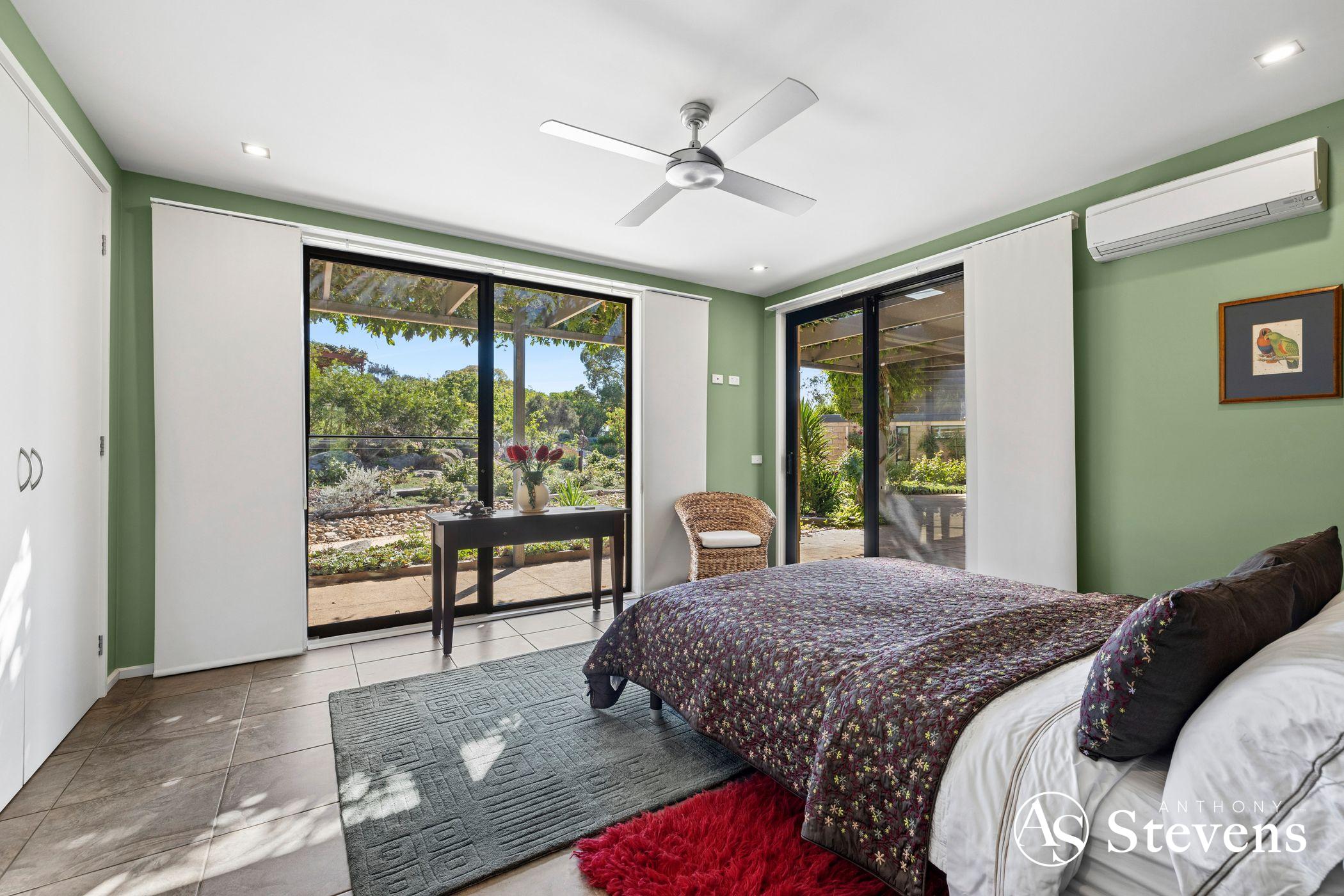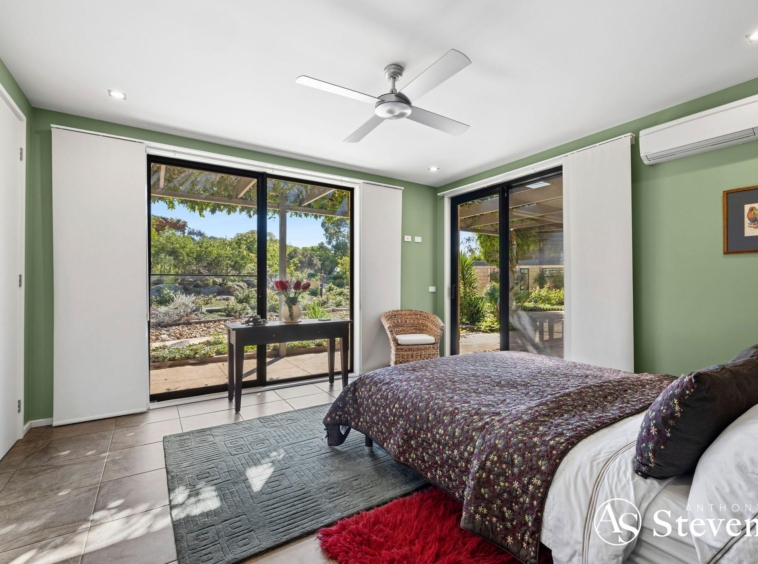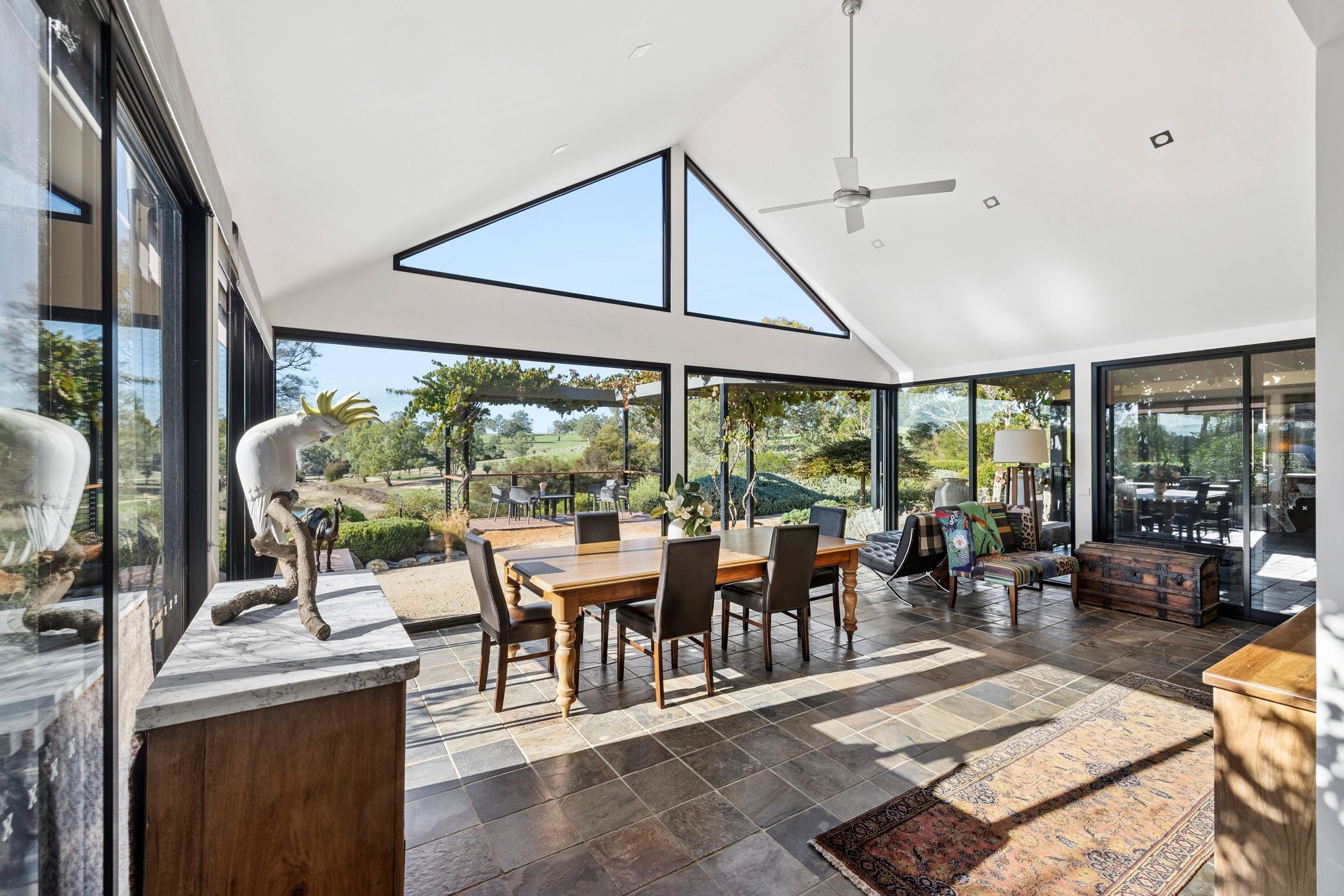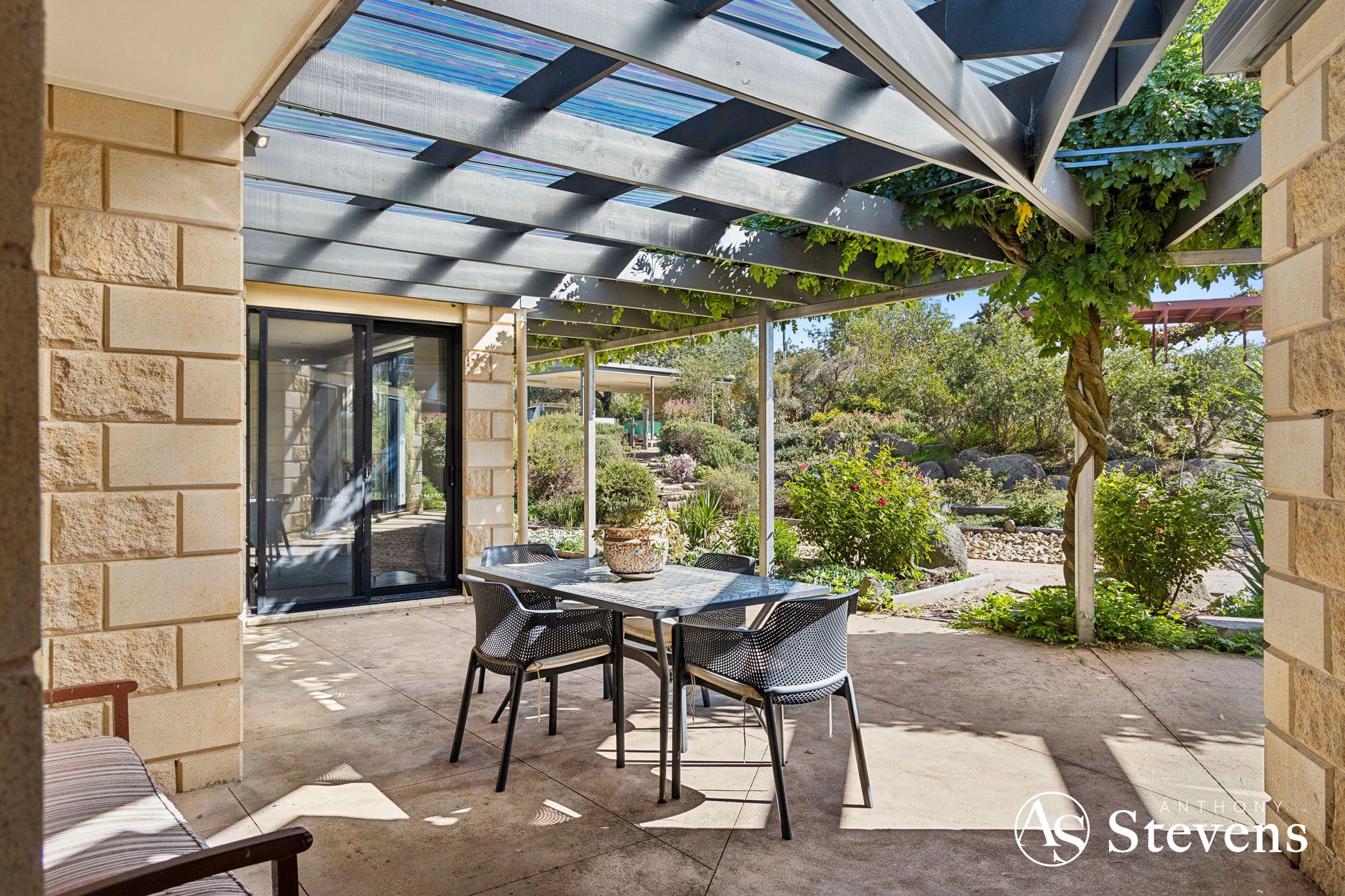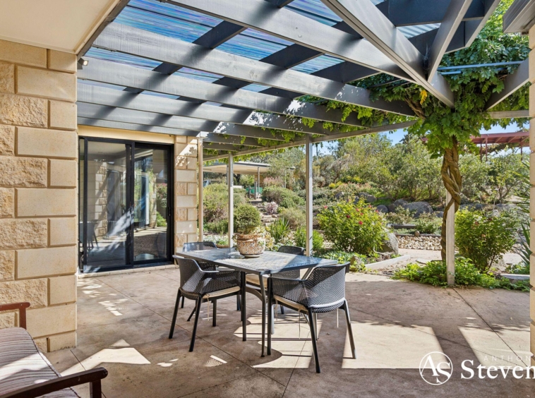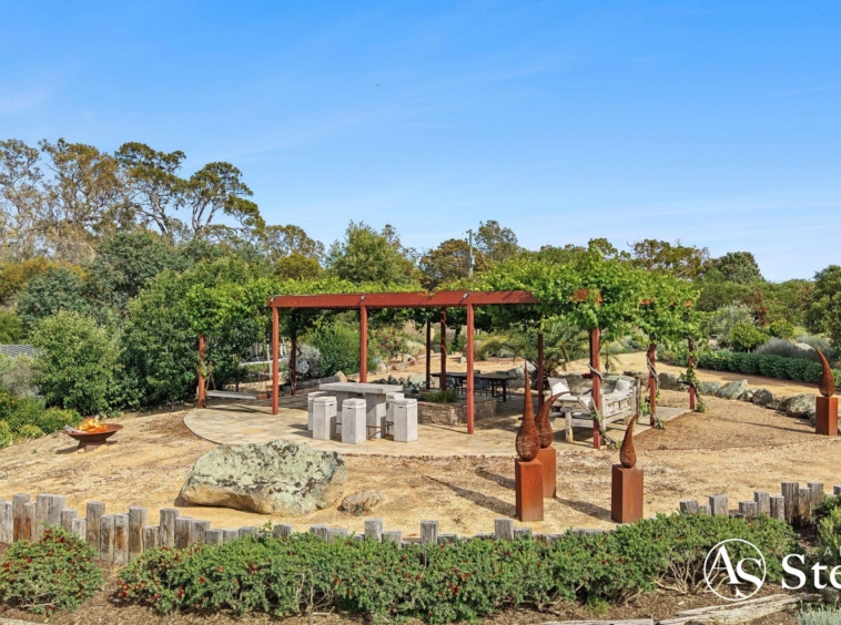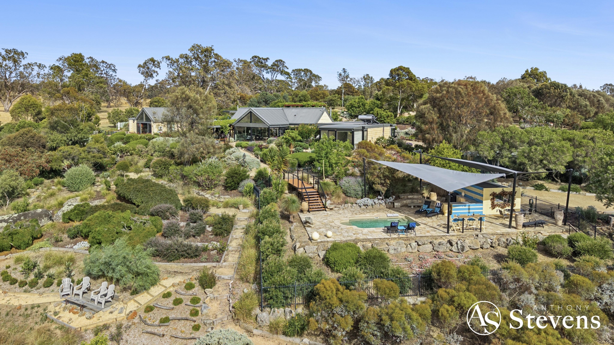 At the heart of the estate lies a five-acre landscaped garden precinct conceived as a series of outdoor rooms rather than a single formal statement. Meandering gravel paths connect drought-resilient native plantings, rose gardens, vine-shaded arbours, sculptural elements and stone terraces, all framed by mature trees and dramatic granite formations.